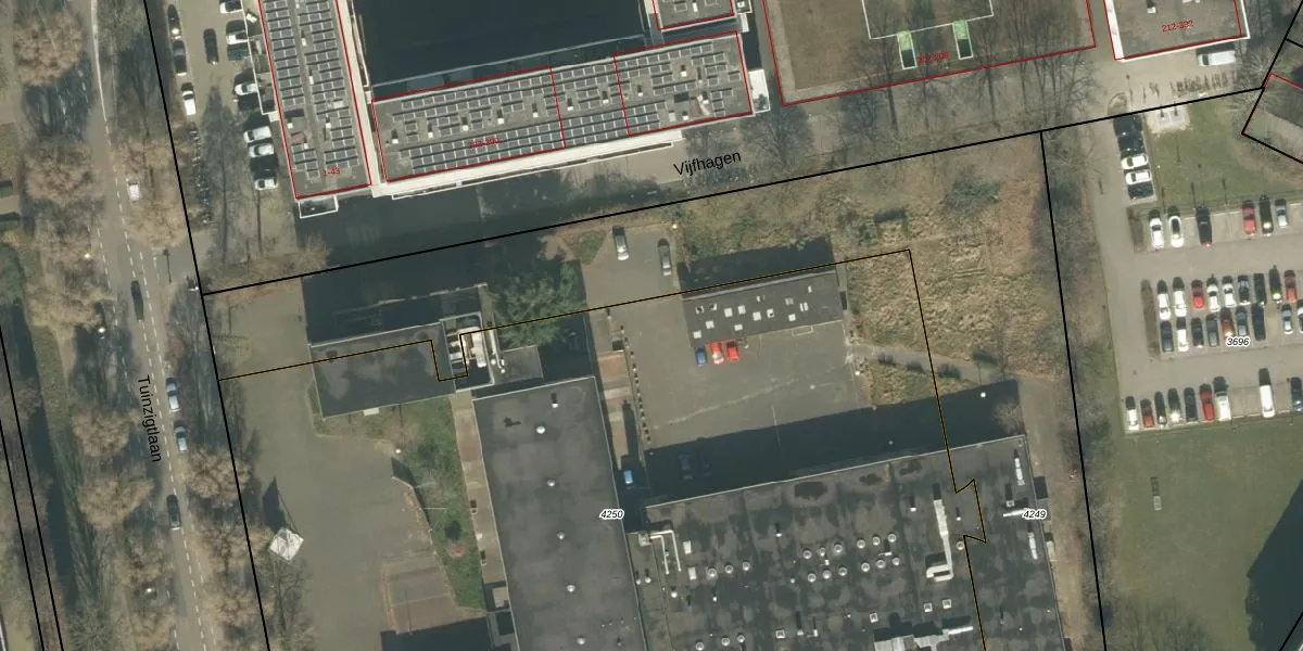 Het perceel waarop Tuinzigtlaan 12-A4 staat heeft een oppervlakte van 7341 m². Dit is een zeer groot perceel. De perceeloppervlakte wordt geregistreerd door het Kadaster. Gedetailleerde informatie over de maten van dit perceel kunt u vinden in het rapport Kadastrale kaart met maatvoering van Tuinzigtlaan 12-A4.