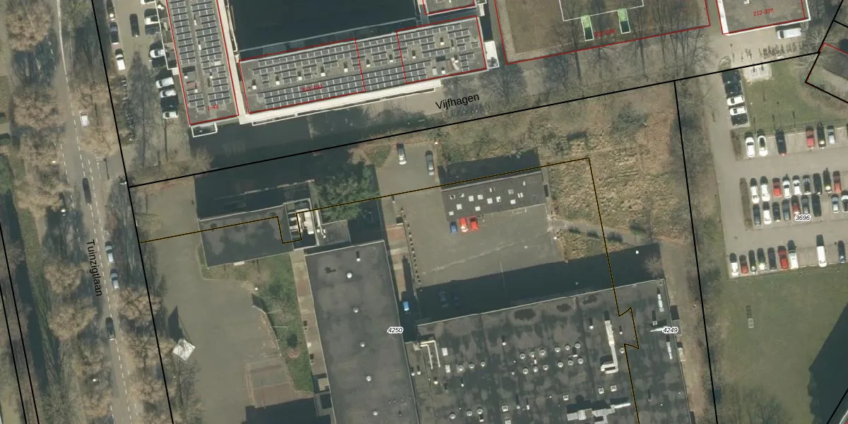 Het perceel waarop Tuinzigtlaan 12-B4 staat heeft een oppervlakte van 7341 m². Dit is een zeer groot perceel. De perceeloppervlakte wordt geregistreerd door het Kadaster. Gedetailleerde informatie over de maten van dit perceel kunt u vinden in het rapport Kadastrale kaart met maatvoering van Tuinzigtlaan 12-B4.