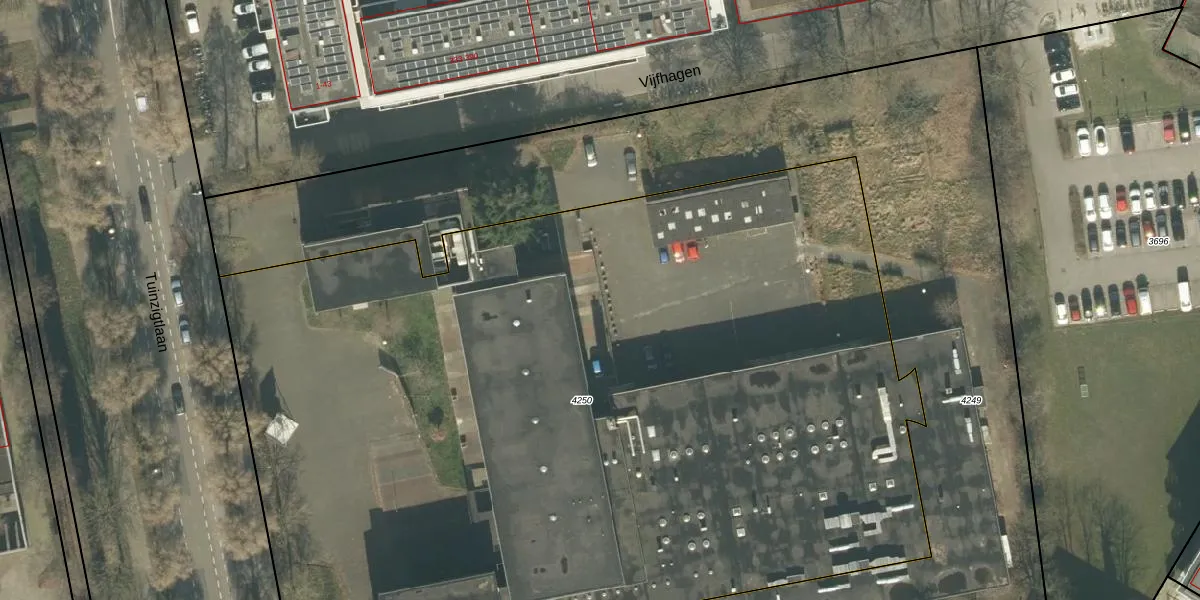 Het perceel waarop Tuinzigtlaan 12-D16 staat heeft een oppervlakte van 7341 m². Dit is een zeer groot perceel. De perceeloppervlakte wordt geregistreerd door het Kadaster. Gedetailleerde informatie over de maten van dit perceel kunt u vinden in het rapport Kadastrale kaart met maatvoering van Tuinzigtlaan 12-D16.