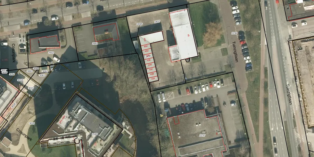 Tuinzigtlaan 43-A is gelegen op kadastraal perceel PCH00P2838. Deze kadastrale aanduiding is uniek en wordt gebruikt door het Kadaster om eigendomsrechten en andere zakelijke rechten vast te leggen. Het perceel maakt onderdeel uit van de kadastrale gemeente Princenhage.