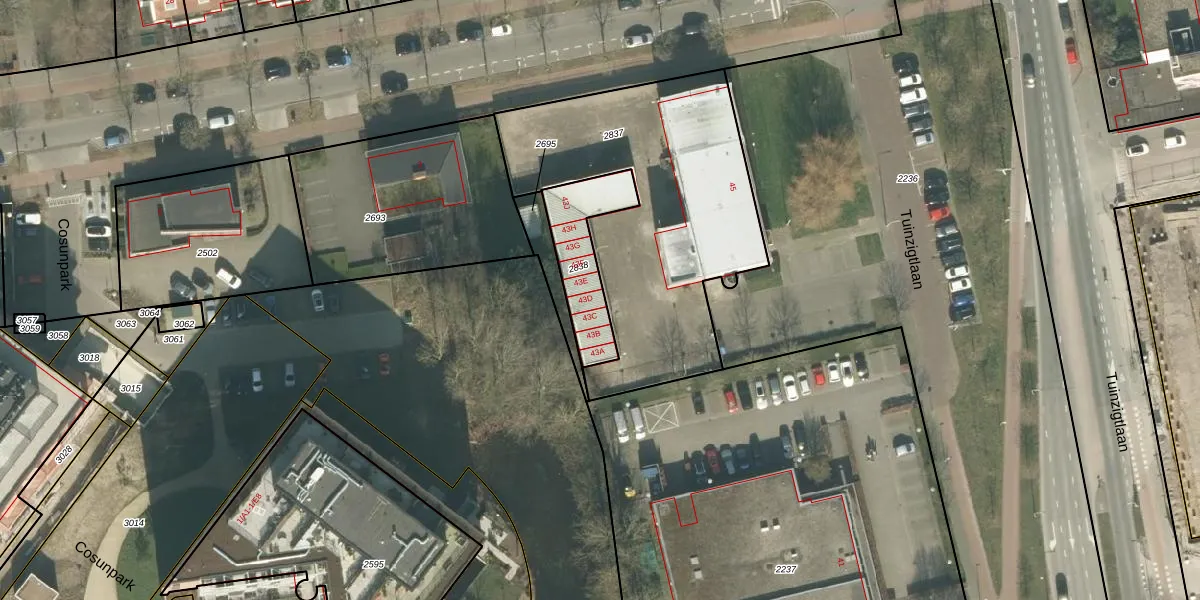 Het perceel waarop Tuinzigtlaan 43-D staat heeft een oppervlakte van 246 m². Dit is een middelgroot perceel. De perceeloppervlakte wordt geregistreerd door het Kadaster. Gedetailleerde informatie over de maten van dit perceel kunt u vinden in het rapport Kadastrale kaart met maatvoering van Tuinzigtlaan 43-D.