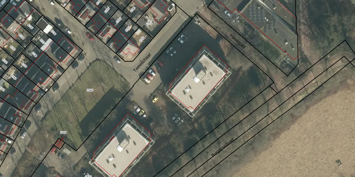 Het perceel waarop Tweeschaar 4-E staat heeft een oppervlakte van 8120 m². Dit is een zeer groot perceel. De perceeloppervlakte wordt geregistreerd door het Kadaster. Gedetailleerde informatie over de maten van dit perceel kunt u vinden in het rapport Kadastrale kaart met maatvoering van Tweeschaar 4-E.