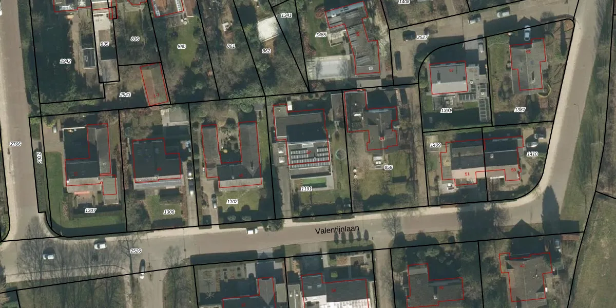 Het perceel waarop Valentijnlaan 47 staat heeft een oppervlakte van 1005 m². Dit is een zeer groot perceel. De perceeloppervlakte wordt geregistreerd door het Kadaster. Gedetailleerde informatie over de maten van dit perceel kunt u vinden in het rapport Kadastrale kaart met maatvoering van Valentijnlaan 47.