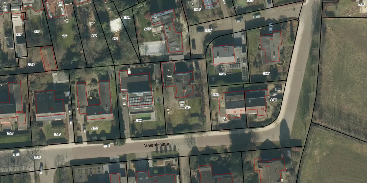 Het perceel waarop Valentijnlaan 49 staat heeft een oppervlakte van 1000 m². Dit is een zeer groot perceel. De perceeloppervlakte wordt geregistreerd door het Kadaster. Gedetailleerde informatie over de maten van dit perceel kunt u vinden in het rapport Kadastrale kaart met maatvoering van Valentijnlaan 49.