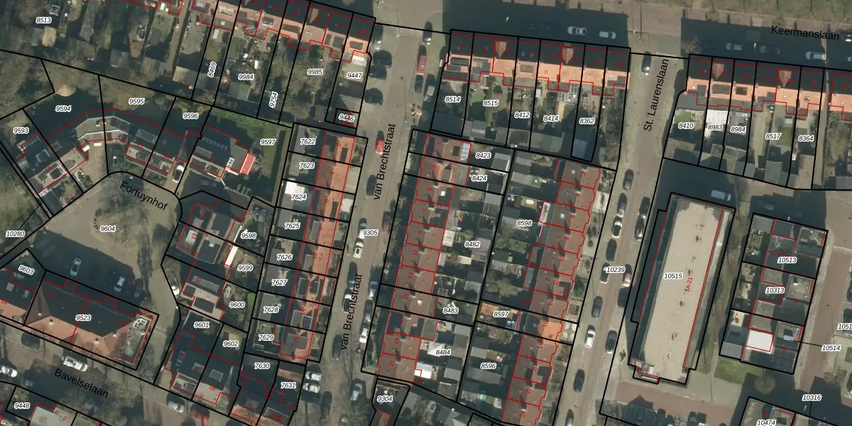Het perceel waarop van Brechtstraat 7 staat heeft een oppervlakte van 630 m². Dit is een groot perceel. De perceeloppervlakte wordt geregistreerd door het Kadaster. Gedetailleerde informatie over de maten van dit perceel kunt u vinden in het rapport Kadastrale kaart met maatvoering van van Brechtstraat 7.