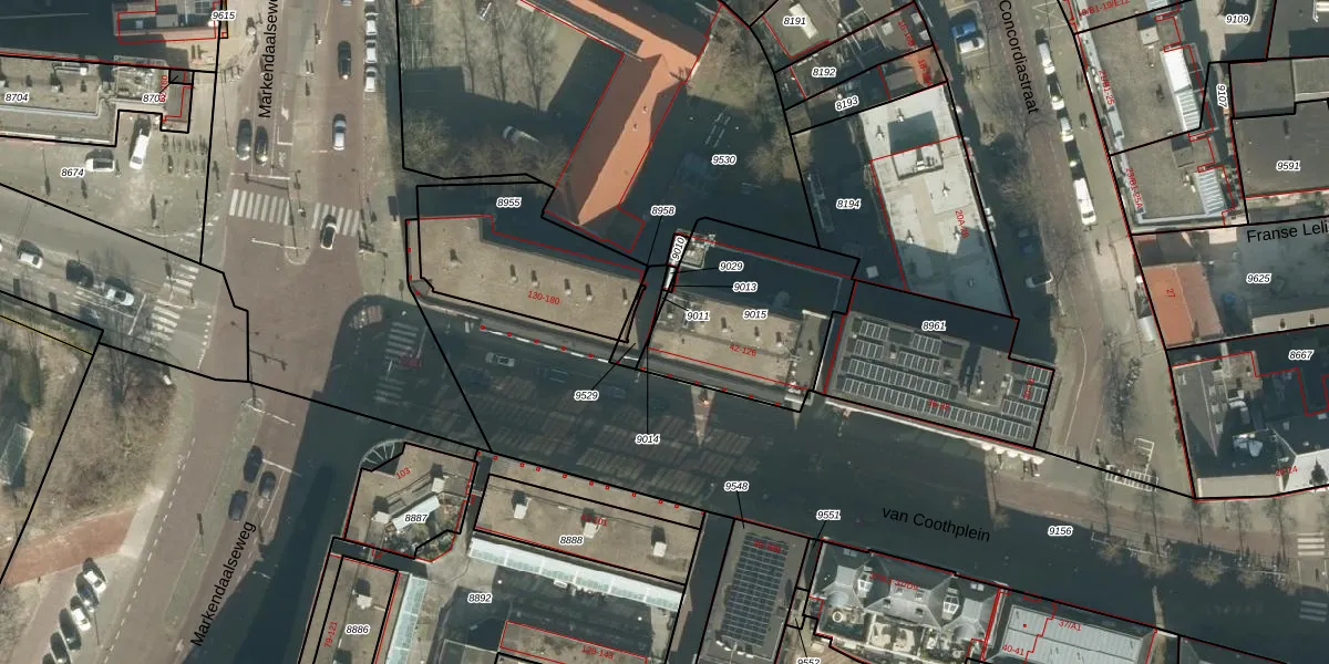 Het perceel waarop van Coothplein 126 staat heeft een oppervlakte van 630 m². Dit is een groot perceel. De perceeloppervlakte wordt geregistreerd door het Kadaster. Gedetailleerde informatie over de maten van dit perceel kunt u vinden in het rapport Kadastrale kaart met maatvoering van van Coothplein 126.