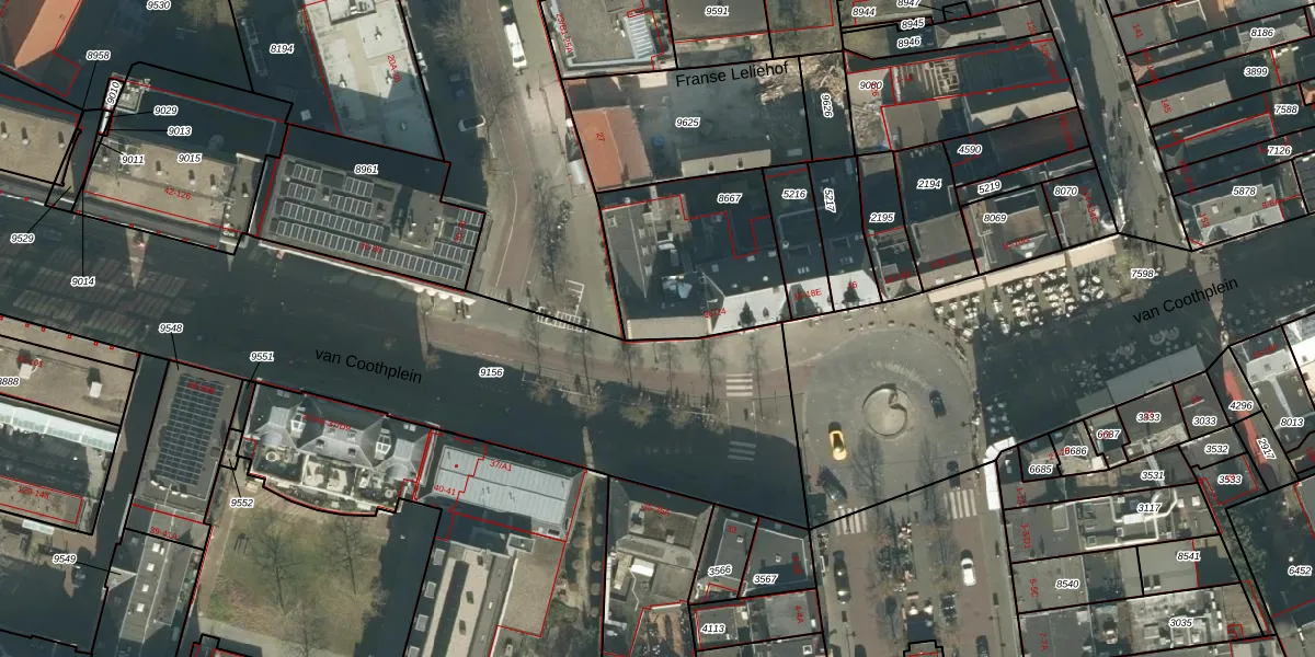 Het perceel waarop van Coothplein 24 staat heeft een oppervlakte van 619 m². Dit is een groot perceel. De perceeloppervlakte wordt geregistreerd door het Kadaster. Gedetailleerde informatie over de maten van dit perceel kunt u vinden in het rapport Kadastrale kaart met maatvoering van van Coothplein 24.