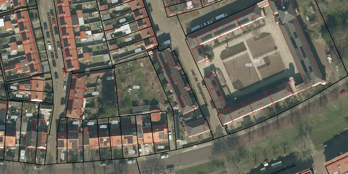 Het perceel waarop van de Spiegelstraat 48-A staat heeft een oppervlakte van 950 m². Dit is een groot perceel. De perceeloppervlakte wordt geregistreerd door het Kadaster. Gedetailleerde informatie over de maten van dit perceel kunt u vinden in het rapport Kadastrale kaart met maatvoering van van de Spiegelstraat 48-A.