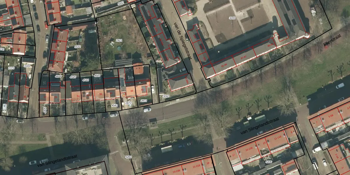 Het perceel waarop van de Spiegelstraat 54-A staat heeft een oppervlakte van 950 m². Dit is een groot perceel. De perceeloppervlakte wordt geregistreerd door het Kadaster. Gedetailleerde informatie over de maten van dit perceel kunt u vinden in het rapport Kadastrale kaart met maatvoering van van de Spiegelstraat 54-A.