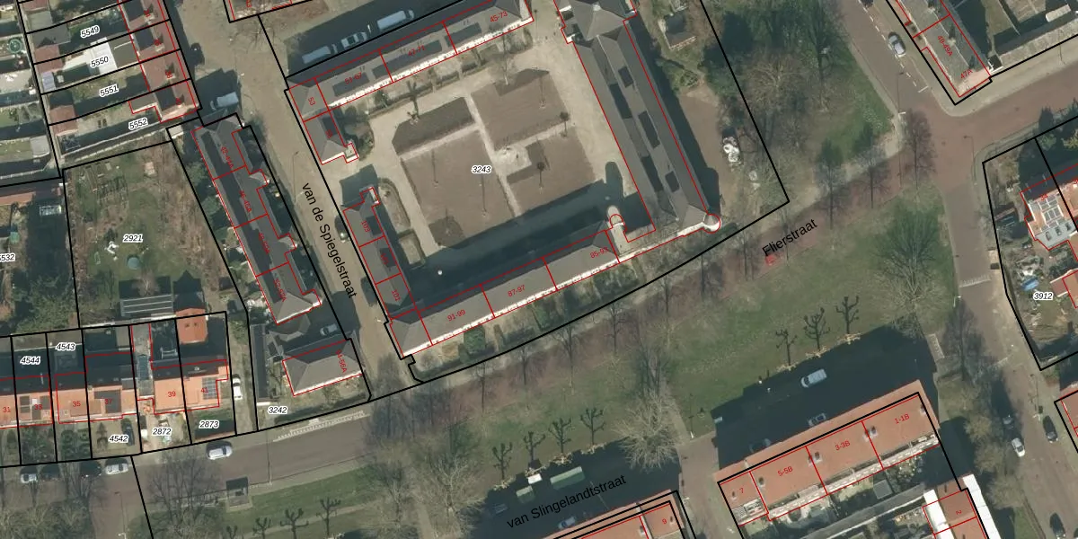 Het perceel waarop van de Spiegelstraat 87 staat heeft een oppervlakte van 4765 m². Dit is een zeer groot perceel. De perceeloppervlakte wordt geregistreerd door het Kadaster. Gedetailleerde informatie over de maten van dit perceel kunt u vinden in het rapport Kadastrale kaart met maatvoering van van de Spiegelstraat 87.