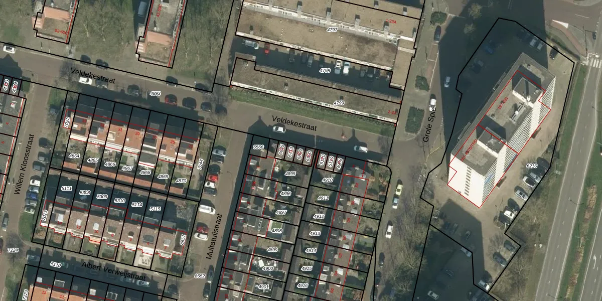 Veldekestraat 13 is gelegen op kadastraal perceel BDA00E6899. Deze kadastrale aanduiding is uniek en wordt gebruikt door het Kadaster om eigendomsrechten en andere zakelijke rechten vast te leggen. Het perceel maakt onderdeel uit van de kadastrale gemeente Breda.