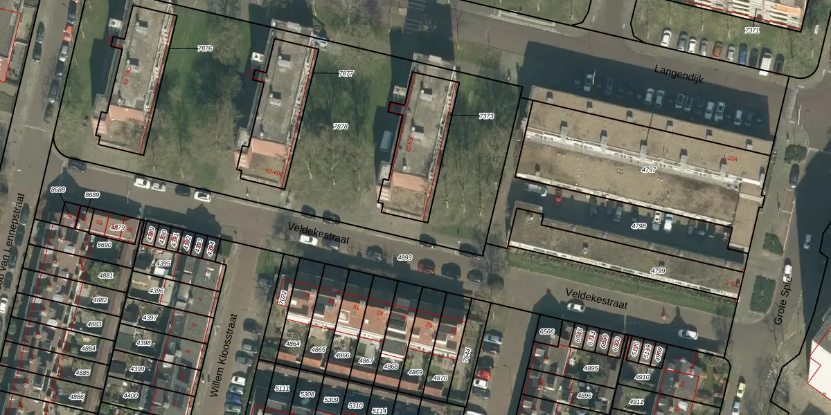 Veldekestraat 42 is gelegen op kadastraal perceel BDA00E7373. Deze kadastrale aanduiding is uniek en wordt gebruikt door het Kadaster om eigendomsrechten en andere zakelijke rechten vast te leggen. Het perceel maakt onderdeel uit van de kadastrale gemeente Breda.