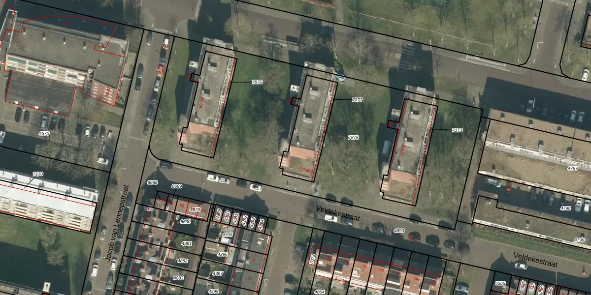 Veldekestraat 56 is gelegen op kadastraal perceel BDA00E7877. Deze kadastrale aanduiding is uniek en wordt gebruikt door het Kadaster om eigendomsrechten en andere zakelijke rechten vast te leggen. Het perceel maakt onderdeel uit van de kadastrale gemeente Breda.