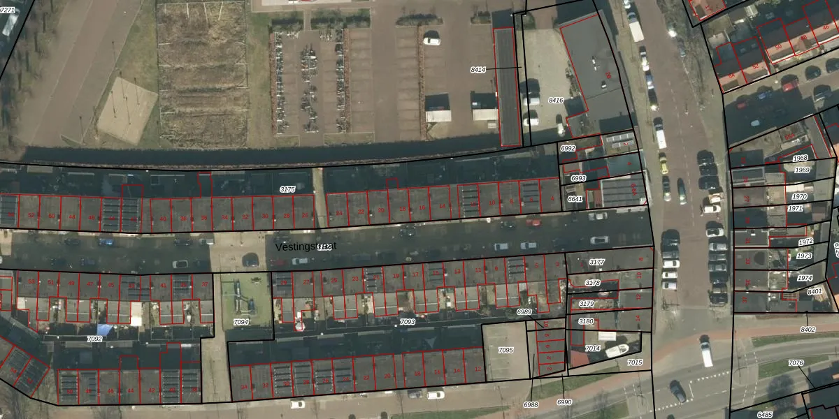 Het perceel waarop Vestingstraat 16 staat heeft een oppervlakte van 2150 m². Dit is een zeer groot perceel. De perceeloppervlakte wordt geregistreerd door het Kadaster. Gedetailleerde informatie over de maten van dit perceel kunt u vinden in het rapport Kadastrale kaart met maatvoering van Vestingstraat 16.