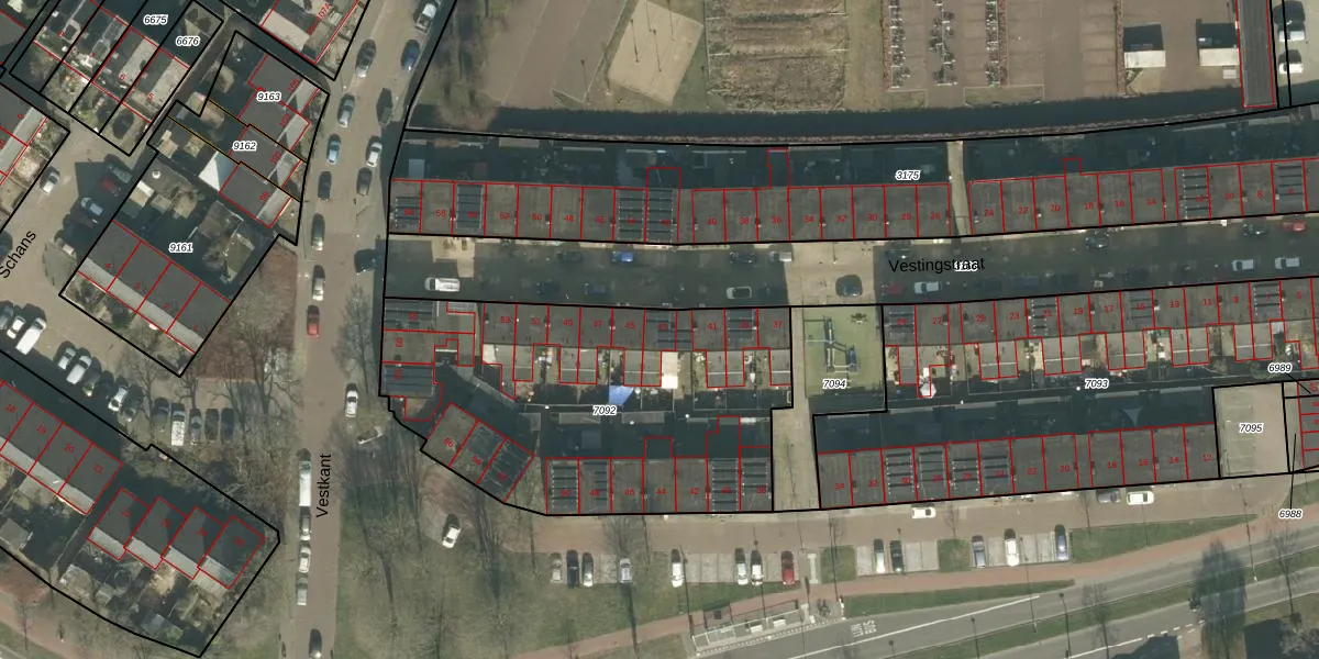 Het perceel waarop Vestingstraat 43 staat heeft een oppervlakte van 1765 m². Dit is een zeer groot perceel. De perceeloppervlakte wordt geregistreerd door het Kadaster. Gedetailleerde informatie over de maten van dit perceel kunt u vinden in het rapport Kadastrale kaart met maatvoering van Vestingstraat 43.