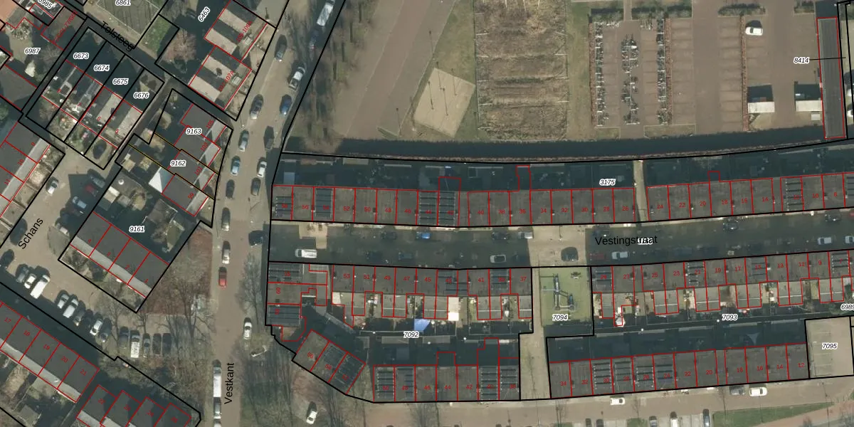 Het perceel waarop Vestingstraat 44 staat heeft een oppervlakte van 2150 m². Dit is een zeer groot perceel. De perceeloppervlakte wordt geregistreerd door het Kadaster. Gedetailleerde informatie over de maten van dit perceel kunt u vinden in het rapport Kadastrale kaart met maatvoering van Vestingstraat 44.