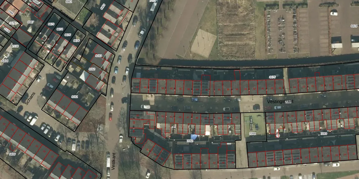Het perceel waarop Vestingstraat 48 staat heeft een oppervlakte van 2150 m². Dit is een zeer groot perceel. De perceeloppervlakte wordt geregistreerd door het Kadaster. Gedetailleerde informatie over de maten van dit perceel kunt u vinden in het rapport Kadastrale kaart met maatvoering van Vestingstraat 48.
