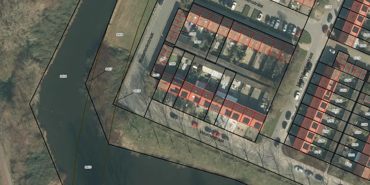 Het perceel waarop Veurnestraat 54 staat heeft een oppervlakte van 2712 m². Dit is een zeer groot perceel. De perceeloppervlakte wordt geregistreerd door het Kadaster. Gedetailleerde informatie over de maten van dit perceel kunt u vinden in het rapport Kadastrale kaart met maatvoering van Veurnestraat 54.