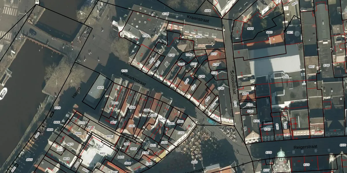 Het perceel waarop Vismarktstraat 16 staat heeft een oppervlakte van 95 m². Dit is een klein perceel. De perceeloppervlakte wordt geregistreerd door het Kadaster. Gedetailleerde informatie over de maten van dit perceel kunt u vinden in het rapport Kadastrale kaart met maatvoering van Vismarktstraat 16.