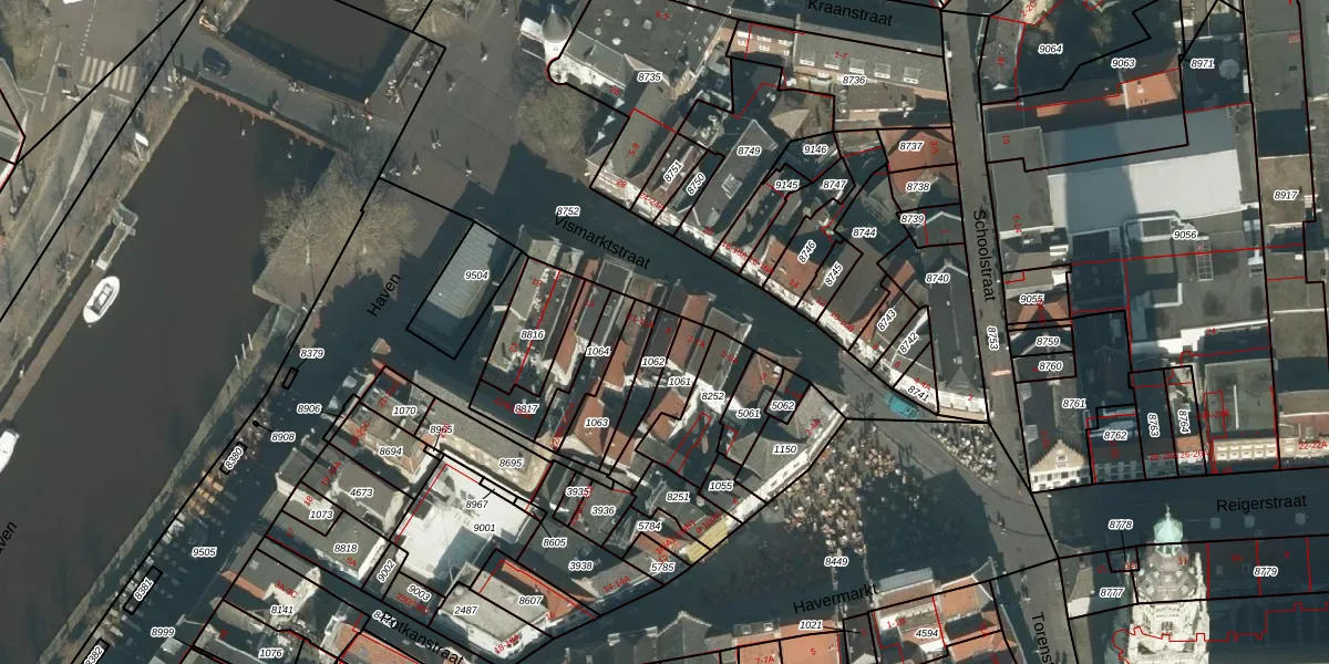 Het perceel waarop Vismarktstraat 9 staat heeft een oppervlakte van 80 m². Dit is een klein perceel. De perceeloppervlakte wordt geregistreerd door het Kadaster. Gedetailleerde informatie over de maten van dit perceel kunt u vinden in het rapport Kadastrale kaart met maatvoering van Vismarktstraat 9.