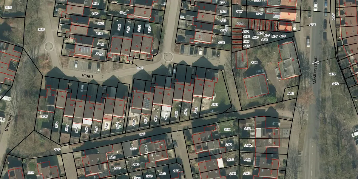 Vloed 84 is gelegen op kadastraal perceel PCH00N2810. Deze kadastrale aanduiding is uniek en wordt gebruikt door het Kadaster om eigendomsrechten en andere zakelijke rechten vast te leggen. Het perceel maakt onderdeel uit van de kadastrale gemeente Princenhage.