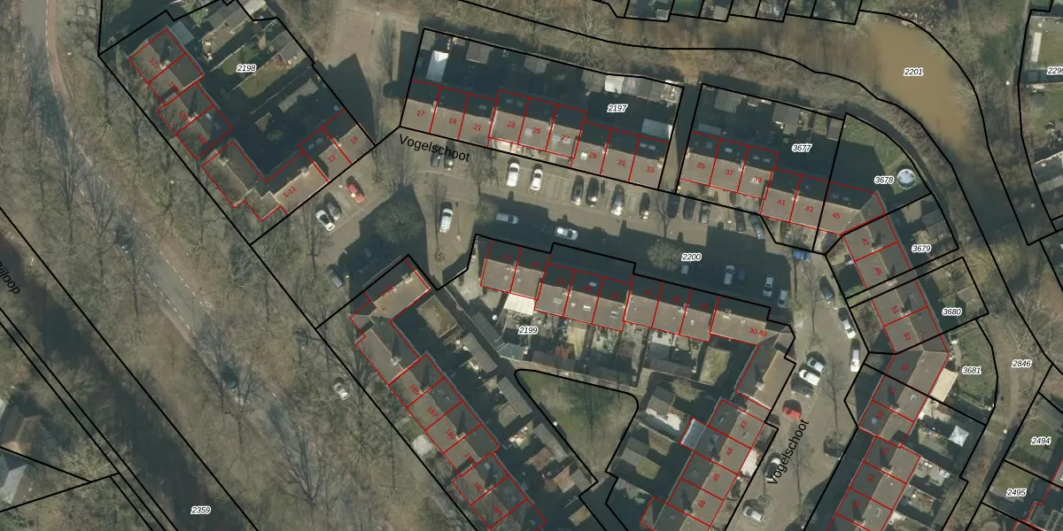 Vogelschoot 16 is gelegen op kadastraal perceel PCH00N2199. Deze kadastrale aanduiding is uniek en wordt gebruikt door het Kadaster om eigendomsrechten en andere zakelijke rechten vast te leggen. Het perceel maakt onderdeel uit van de kadastrale gemeente Princenhage.