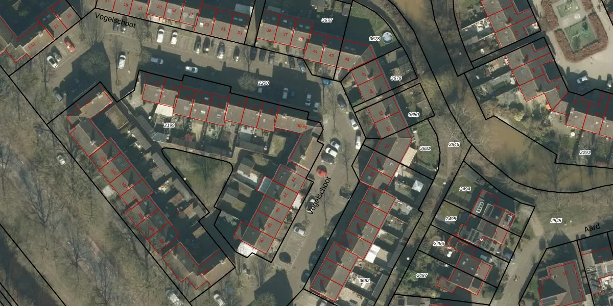 Vogelschoot 36 is gelegen op kadastraal perceel PCH00N2199. Deze kadastrale aanduiding is uniek en wordt gebruikt door het Kadaster om eigendomsrechten en andere zakelijke rechten vast te leggen. Het perceel maakt onderdeel uit van de kadastrale gemeente Princenhage.