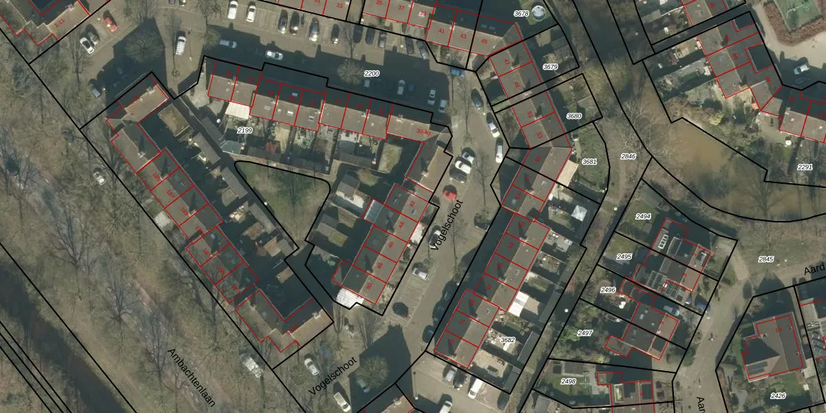 Het perceel waarop Vogelschoot 42 staat heeft een oppervlakte van 3705 m². Dit is een zeer groot perceel. De perceeloppervlakte wordt geregistreerd door het Kadaster. Gedetailleerde informatie over de maten van dit perceel kunt u vinden in het rapport Kadastrale kaart met maatvoering van Vogelschoot 42.