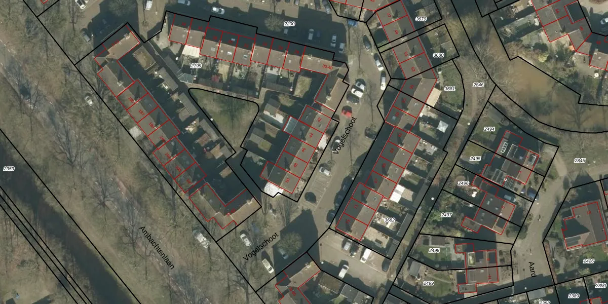 Het perceel waarop Vogelschoot 46 staat heeft een oppervlakte van 3705 m². Dit is een zeer groot perceel. De perceeloppervlakte wordt geregistreerd door het Kadaster. Gedetailleerde informatie over de maten van dit perceel kunt u vinden in het rapport Kadastrale kaart met maatvoering van Vogelschoot 46.