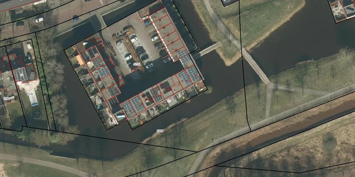 Het perceel waarop Volterra 13 staat heeft een oppervlakte van 3680 m². Dit is een zeer groot perceel. De perceeloppervlakte wordt geregistreerd door het Kadaster. Gedetailleerde informatie over de maten van dit perceel kunt u vinden in het rapport Kadastrale kaart met maatvoering van Volterra 13.