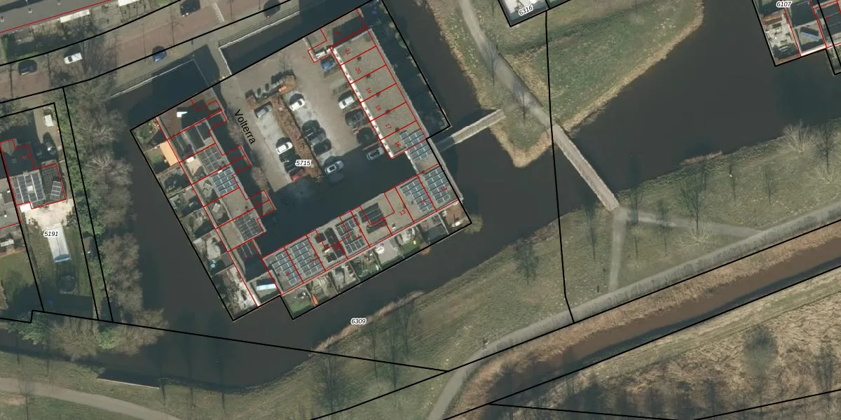 Het perceel waarop Volterra 14 staat heeft een oppervlakte van 3680 m². Dit is een zeer groot perceel. De perceeloppervlakte wordt geregistreerd door het Kadaster. Gedetailleerde informatie over de maten van dit perceel kunt u vinden in het rapport Kadastrale kaart met maatvoering van Volterra 14.