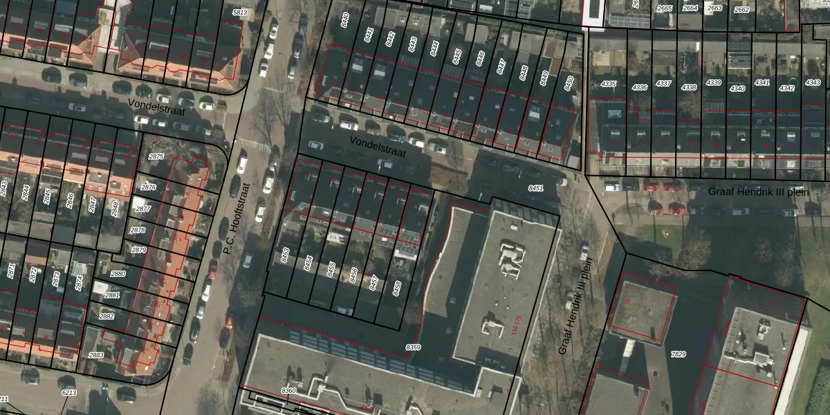 Het perceel waarop Vondelstraat 1 staat heeft een oppervlakte van 214 m². Dit is een middelgroot perceel. De perceeloppervlakte wordt geregistreerd door het Kadaster. Gedetailleerde informatie over de maten van dit perceel kunt u vinden in het rapport Kadastrale kaart met maatvoering van Vondelstraat 1.