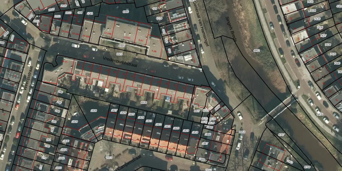 Het perceel waarop het adres ligt is BDA00-E-8438. De afkorting 'BDA00' staat voor kadastrale gemeente Breda. De oppervlakte van het perceel is 1710 m². Dat is groter dan gemiddeld in Breda, waar de gemiddelde perceeloppervlakte op 1059,16 m² ligt. Het kleinste perceel in de kadastrale gemeente is 0 m² groot. De grootste perceeloppervlakte is 44,1 ha. Op het perceel liggen in totaal 20 adressen. De huidige grenzen van het perceel zijn digitaal in de Basisregistratie Kadaster (BRK) geregistreerd op 22-07-2009.