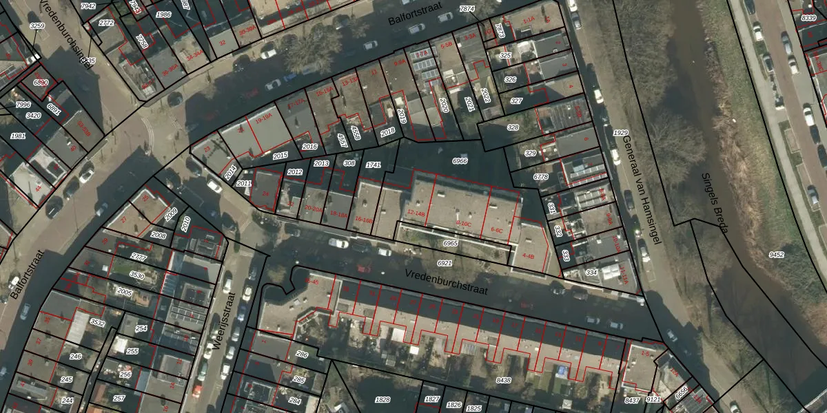 Vredenburchstraat 12-A is gelegen op kadastraal perceel BDA00E6966. Deze kadastrale aanduiding is uniek en wordt gebruikt door het Kadaster om eigendomsrechten en andere zakelijke rechten vast te leggen. Het perceel maakt onderdeel uit van de kadastrale gemeente Breda.