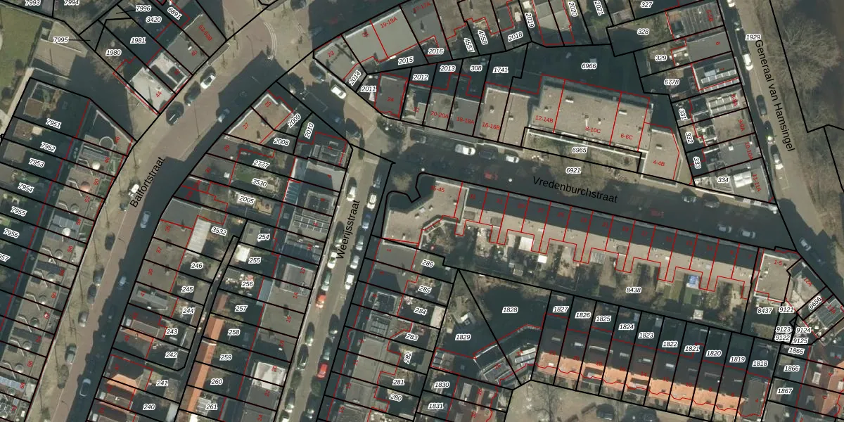 Het perceel waarop Vredenburchstraat 45 staat heeft een oppervlakte van 1710 m². Dit is een zeer groot perceel. De perceeloppervlakte wordt geregistreerd door het Kadaster. Gedetailleerde informatie over de maten van dit perceel kunt u vinden in het rapport Kadastrale kaart met maatvoering van Vredenburchstraat 45.