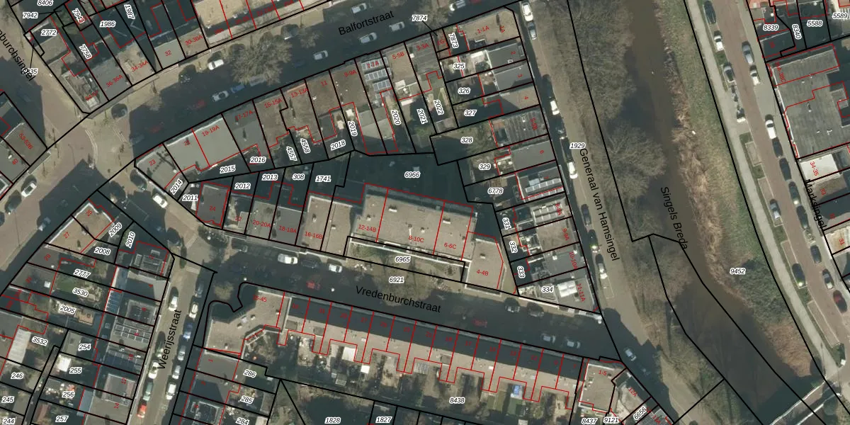 Het perceel waarop het adres ligt is BDA00-E-6966. De afkorting 'BDA00' staat voor kadastrale gemeente Breda. De gemiddelde perceelgrootte in Breda is 1059,16 m². Dit perceel is kleiner: de perceeloppervlakte bedraagt 875 m². Het kleinste perceel in de kadastrale gemeente is 0 m² groot. De grootste perceeloppervlakte is 44,1 ha. Op het perceel liggen in totaal 21 adressen. De huidige grenzen van het perceel zijn digitaal in de Basisregistratie Kadaster (BRK) geregistreerd op 31-10-2006.