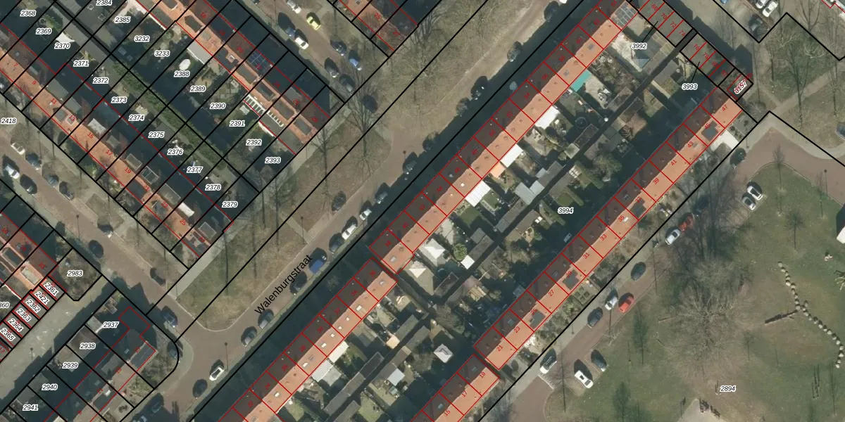 Het perceel waarop Walenburgstraat 42 staat heeft een oppervlakte van 7379 m². Dit is een zeer groot perceel. De perceeloppervlakte wordt geregistreerd door het Kadaster. Gedetailleerde informatie over de maten van dit perceel kunt u vinden in het rapport Kadastrale kaart met maatvoering van Walenburgstraat 42.