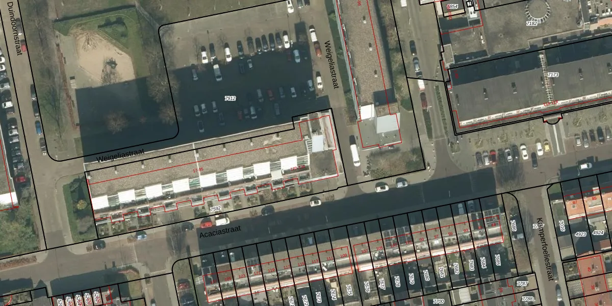 Het perceel waarop Weigeliastraat 87 staat heeft een oppervlakte van 1900 m². Dit is een zeer groot perceel. De perceeloppervlakte wordt geregistreerd door het Kadaster. Gedetailleerde informatie over de maten van dit perceel kunt u vinden in het rapport Kadastrale kaart met maatvoering van Weigeliastraat 87.