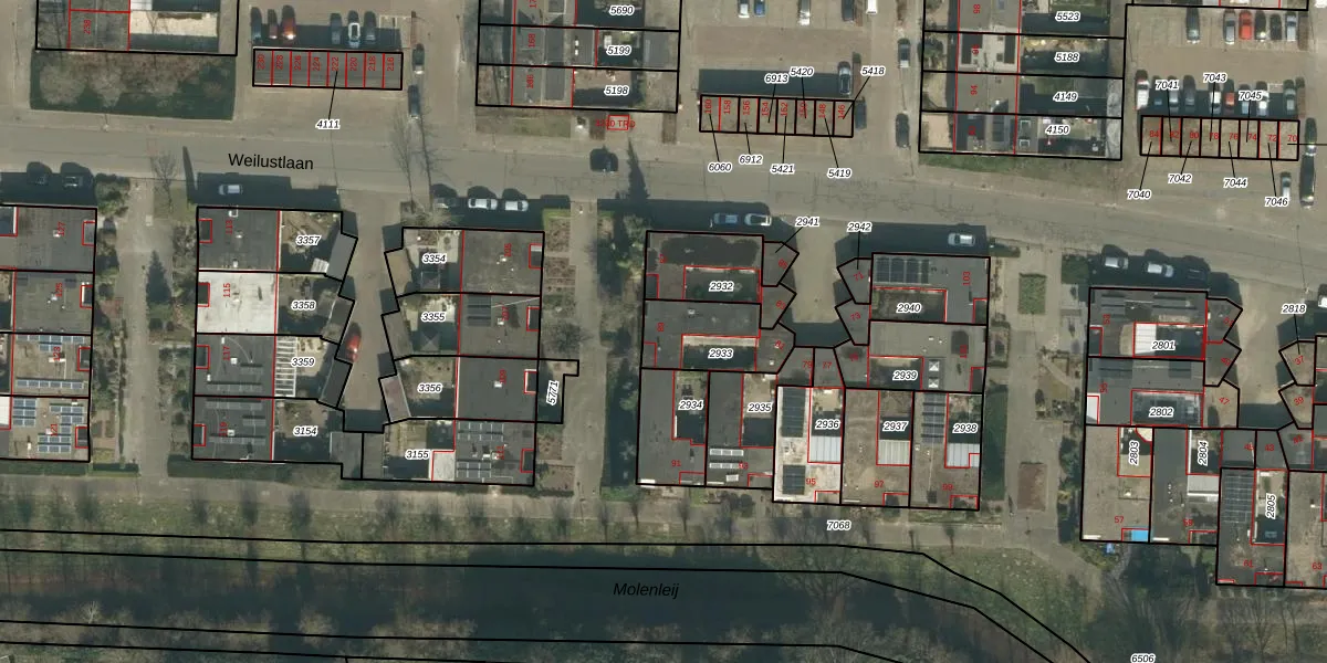 Het perceel waarop Weilustlaan 89 staat heeft een oppervlakte van 213 m². Dit is een middelgroot perceel. De perceeloppervlakte wordt geregistreerd door het Kadaster. Gedetailleerde informatie over de maten van dit perceel kunt u vinden in het rapport Kadastrale kaart met maatvoering van Weilustlaan 89.