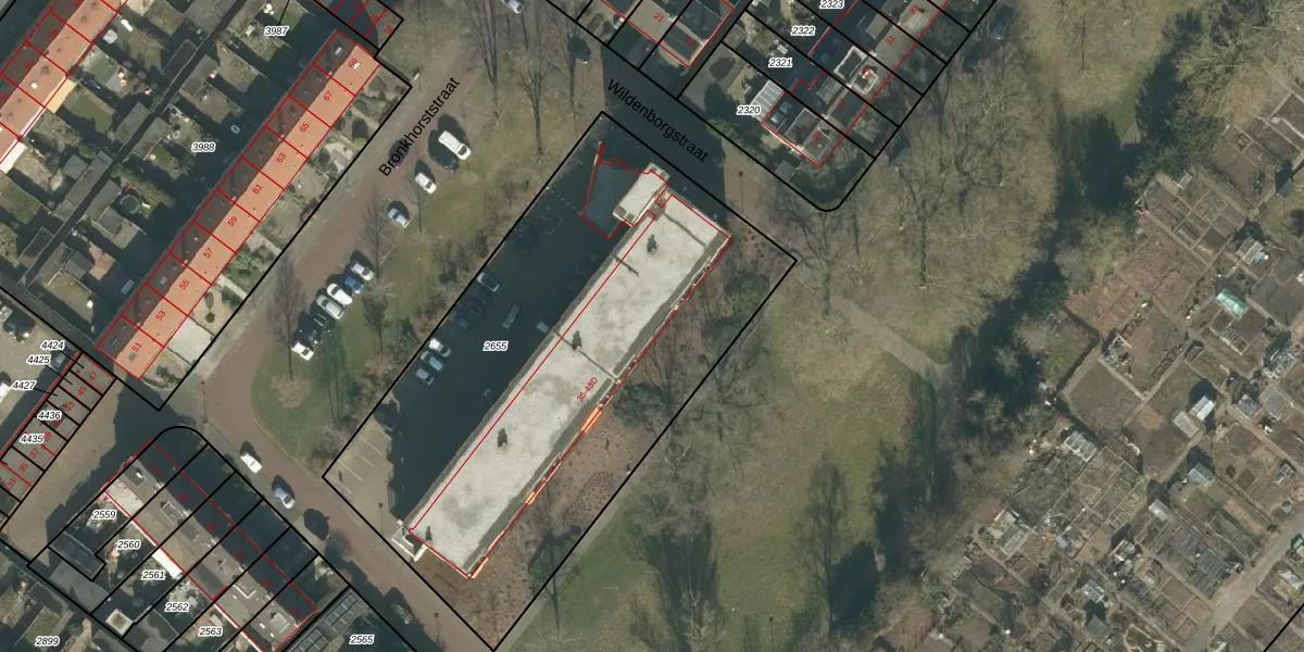 Het perceel waarop Wildenborgstraat 38-D staat heeft een oppervlakte van 2740 m². Dit is een zeer groot perceel. De perceeloppervlakte wordt geregistreerd door het Kadaster. Gedetailleerde informatie over de maten van dit perceel kunt u vinden in het rapport Kadastrale kaart met maatvoering van Wildenborgstraat 38-D.