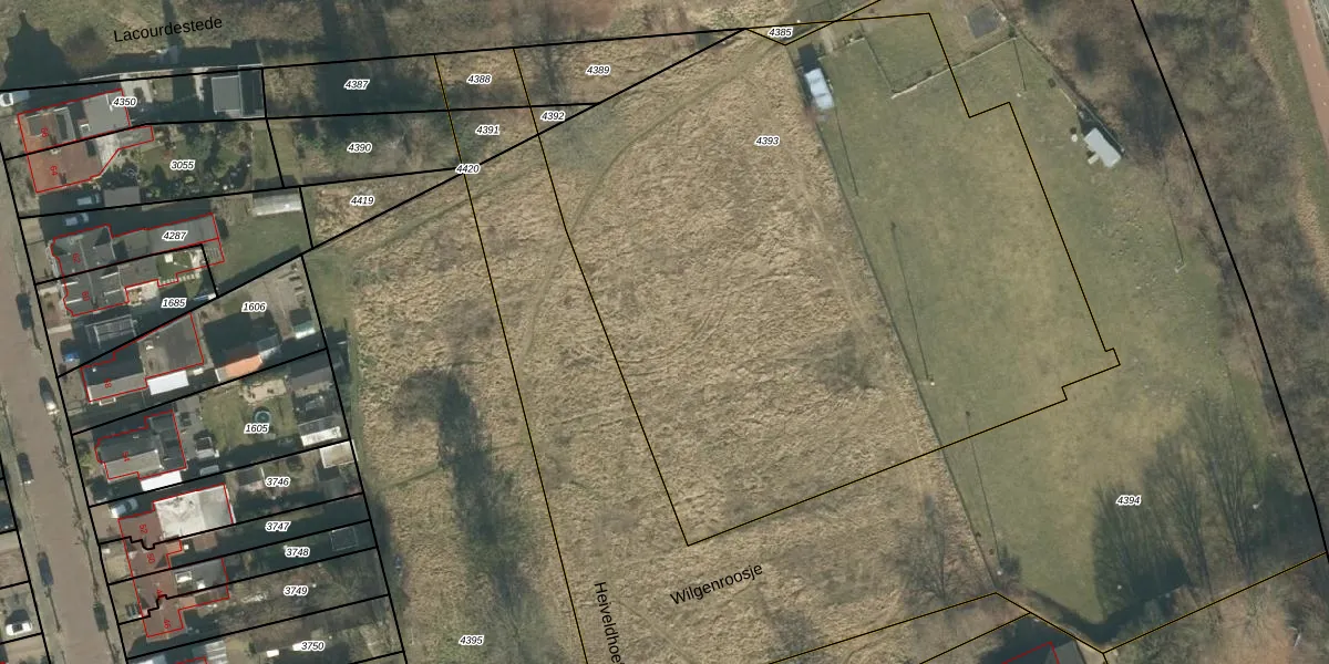 Het perceel waarop Wilgenroosje 23 staat heeft een oppervlakte van 4440 m². Dit is een zeer groot perceel. De perceeloppervlakte wordt geregistreerd door het Kadaster. Gedetailleerde informatie over de maten van dit perceel kunt u vinden in het rapport Kadastrale kaart met maatvoering van Wilgenroosje 23.