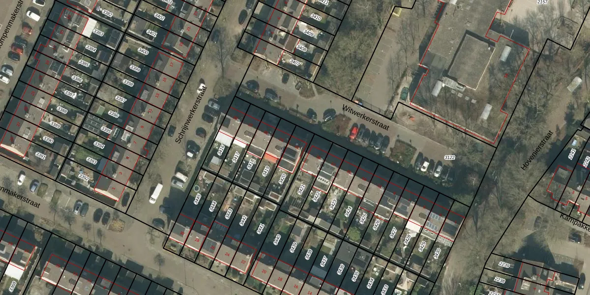 Het perceel waarop Witwerkerstraat 21 staat heeft een oppervlakte van 185 m². Dit is een middelgroot perceel. De perceeloppervlakte wordt geregistreerd door het Kadaster. Gedetailleerde informatie over de maten van dit perceel kunt u vinden in het rapport Kadastrale kaart met maatvoering van Witwerkerstraat 21.