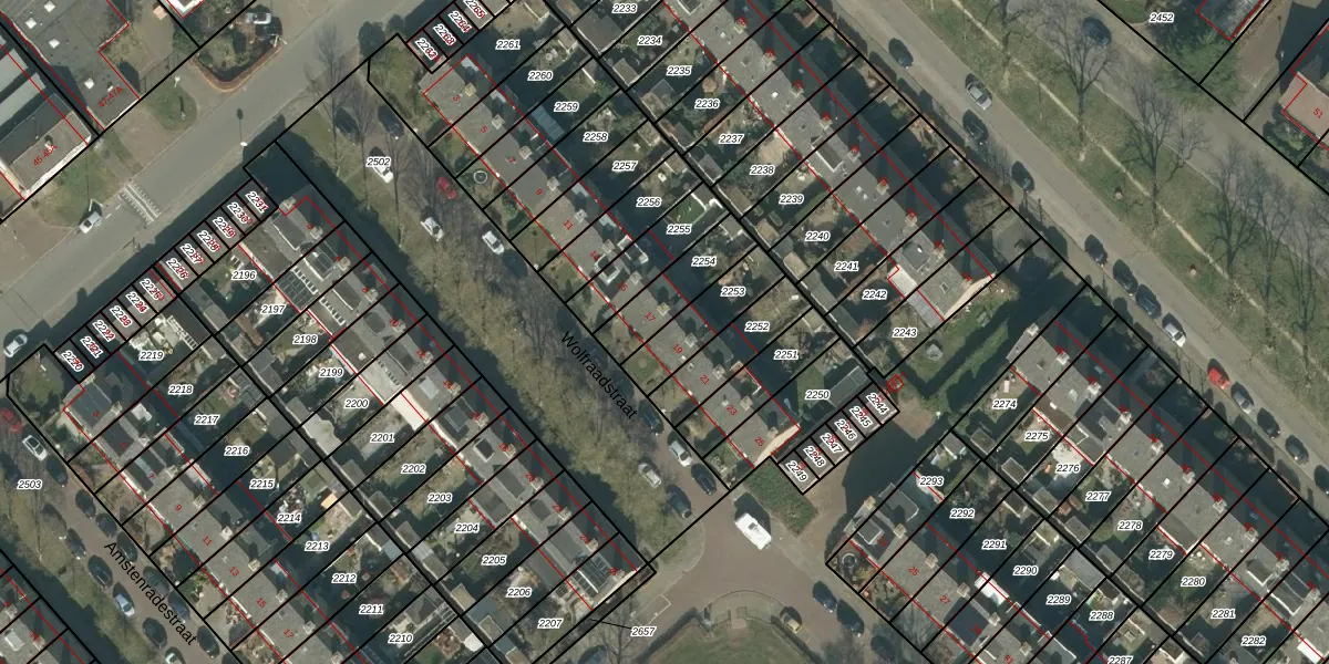 Het perceel waarop Wolfraadstraat 19 staat heeft een oppervlakte van 174 m². Dit is een middelgroot perceel. De perceeloppervlakte wordt geregistreerd door het Kadaster. Gedetailleerde informatie over de maten van dit perceel kunt u vinden in het rapport Kadastrale kaart met maatvoering van Wolfraadstraat 19.