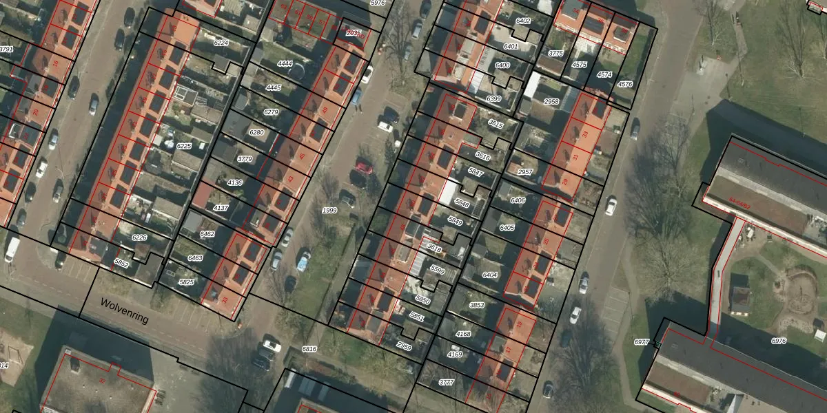 Het perceel waarop Wolvenring 50 staat heeft een oppervlakte van 155 m². Dit is een middelgroot perceel. De perceeloppervlakte wordt geregistreerd door het Kadaster. Gedetailleerde informatie over de maten van dit perceel kunt u vinden in het rapport Kadastrale kaart met maatvoering van Wolvenring 50.