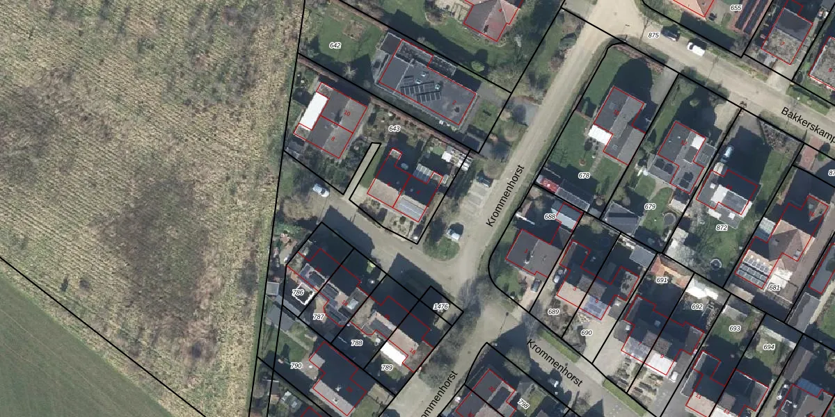 Het perceel waarop Krommenhorst 4 staat heeft een oppervlakte van 1040 m². Dit is een zeer groot perceel. De perceeloppervlakte wordt geregistreerd door het Kadaster. Gedetailleerde informatie over de maten van dit perceel kunt u vinden in het rapport Kadastrale kaart met maatvoering van Krommenhorst 4.