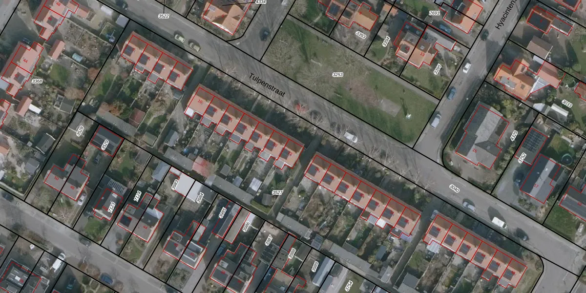 Het perceel waarop Tulpenstraat 22 staat heeft een oppervlakte van 5971 m². Dit is een zeer groot perceel. De perceeloppervlakte wordt geregistreerd door het Kadaster. Gedetailleerde informatie over de maten van dit perceel kunt u vinden in het rapport Kadastrale kaart met maatvoering van Tulpenstraat 22.