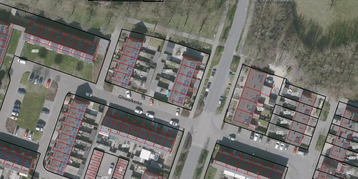Het perceel waarop Ghistelkerke 8 staat heeft een oppervlakte van 1643 m². Dit is een zeer groot perceel. De perceeloppervlakte wordt geregistreerd door het Kadaster. Gedetailleerde informatie over de maten van dit perceel kunt u vinden in het rapport Kadastrale kaart met maatvoering van Ghistelkerke 8.