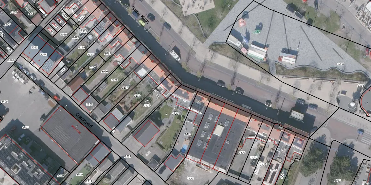 Het perceel waarop Grote Kade 13 staat heeft een oppervlakte van 825 m². Dit is een groot perceel. De perceeloppervlakte wordt geregistreerd door het Kadaster. Gedetailleerde informatie over de maten van dit perceel kunt u vinden in het rapport Kadastrale kaart met maatvoering van Grote Kade 13.