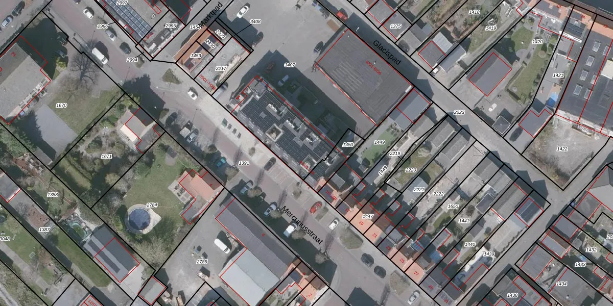 Het perceel waarop Mercuriusstraat 9-105 staat heeft een oppervlakte van 2465 m². Dit is een zeer groot perceel. De perceeloppervlakte wordt geregistreerd door het Kadaster. Gedetailleerde informatie over de maten van dit perceel kunt u vinden in het rapport Kadastrale kaart met maatvoering van Mercuriusstraat 9-105.