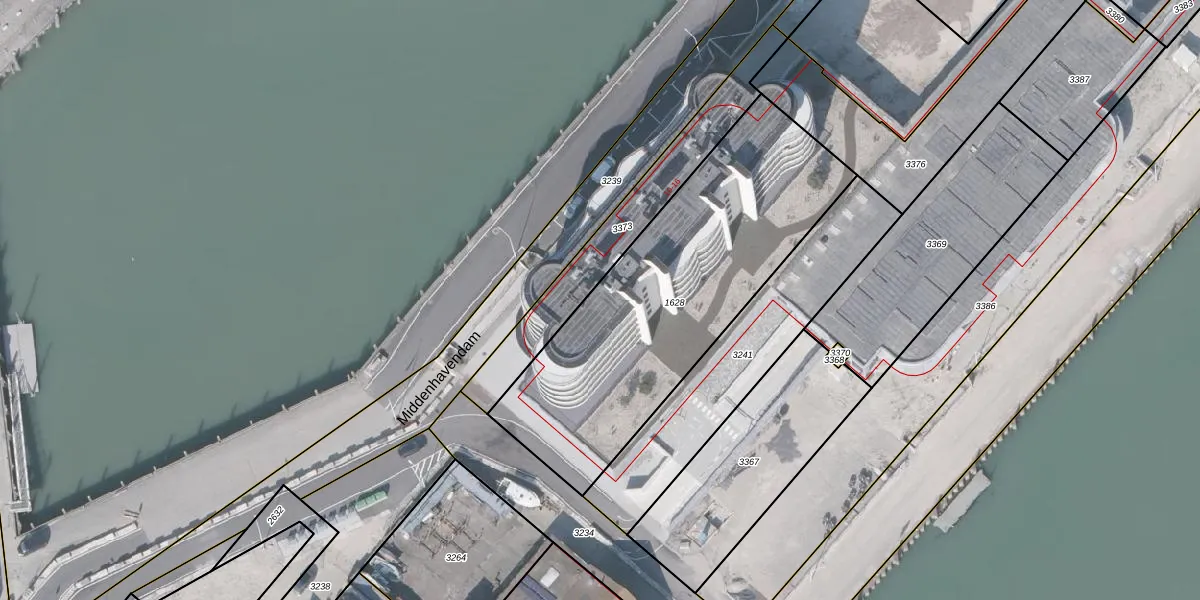 Het perceel waarop Middenhavendam 12-601 staat heeft een oppervlakte van 1470 m². Dit is een zeer groot perceel. De perceeloppervlakte wordt geregistreerd door het Kadaster. Gedetailleerde informatie over de maten van dit perceel kunt u vinden in het rapport Kadastrale kaart met maatvoering van Middenhavendam 12-601.
